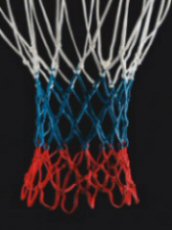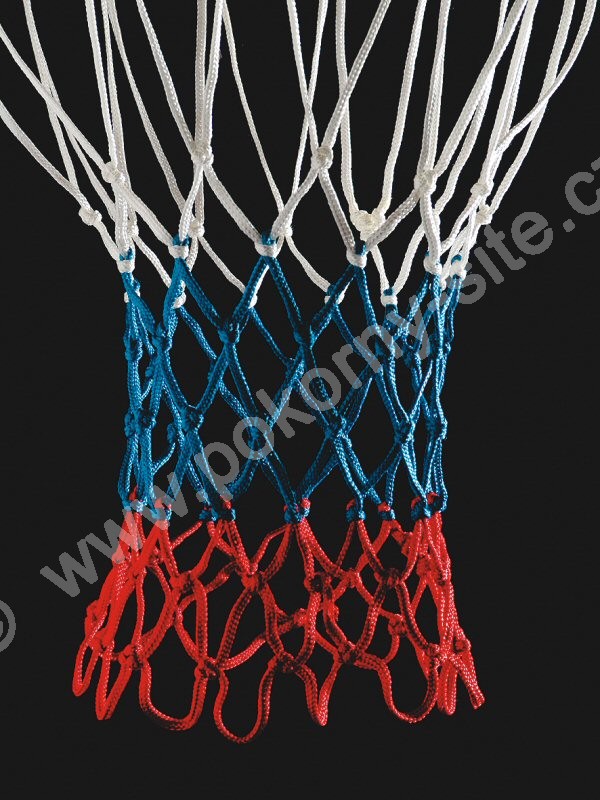 Basic composition: basketball nets are made of hand made netting from polyamide braided cord, white colour, thickness 3, 4 and 5 mm, mesh size 50 mm, the first hanging row of mesh size 100 mm. There are 12 meshes on the perimeter and the ball is hindered inside the net when falling through.